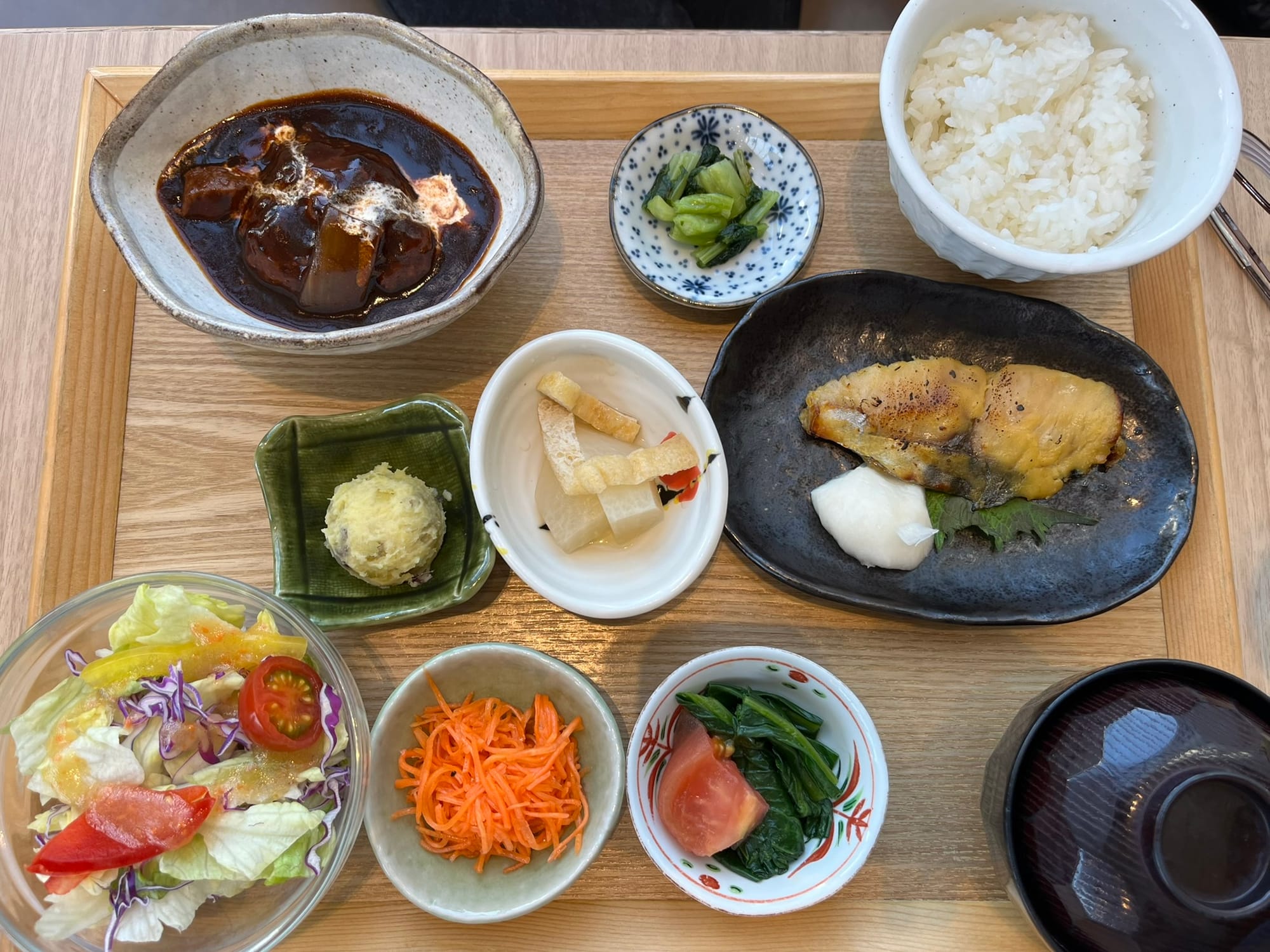 Our second day in Tokyo, after more indecisive food-shopping, we stepped into a bustling restaurant inside Mitsukoshi Ginza with a skyline view of the city. They served traditional Japanese-style "sets," with tiny bowls and platters of a variety of vegetables, fish, and sides.
