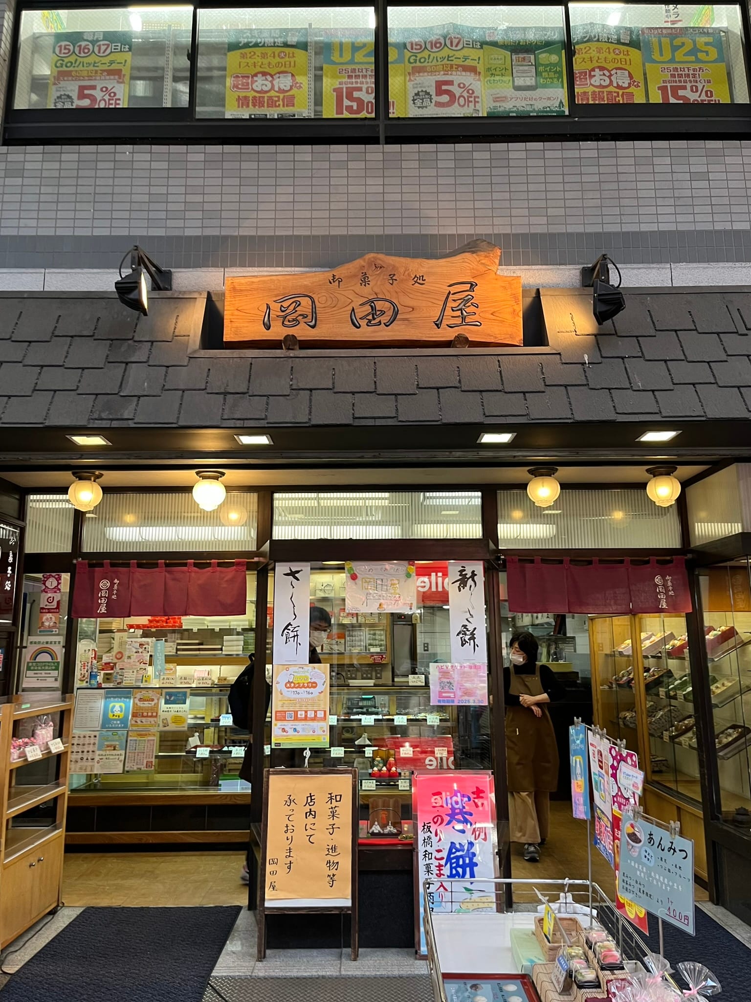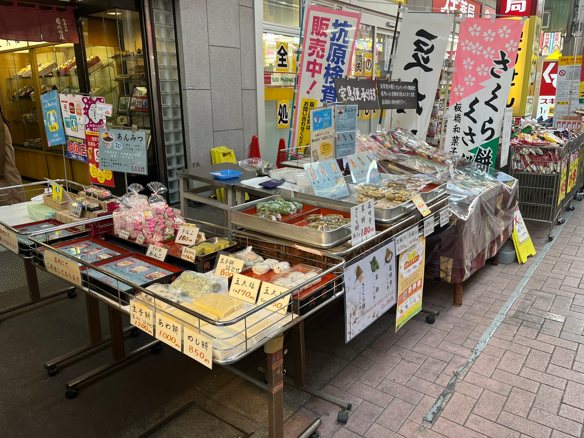 The street is a covered market, with local sellers displaying their freshly made mochi and pastries in the mornings to sell.